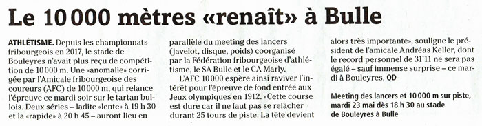 Le mardi, 23 mai 2023, l'Amicale fribourgeoise des coureurs de 10'000 m a organisé pour la première fois depuis le début du 3e millénaire une soirée de 10'000 m sur piste, la " 1ère Course de 10'000 m de l'AFC10000 ". Elle a eu lieu au stade de Bouleyres à Bulle et a été ouverte à toutes et à tous sans aucune limitation. La course est néanmoins homologuée FFA et Swiss Athletics. Les temps mesurés sont donc des résultats officiels et permettront d'être reconnus comme records, mais aussi comme temps limite pour rejoindre l'AFC10000.